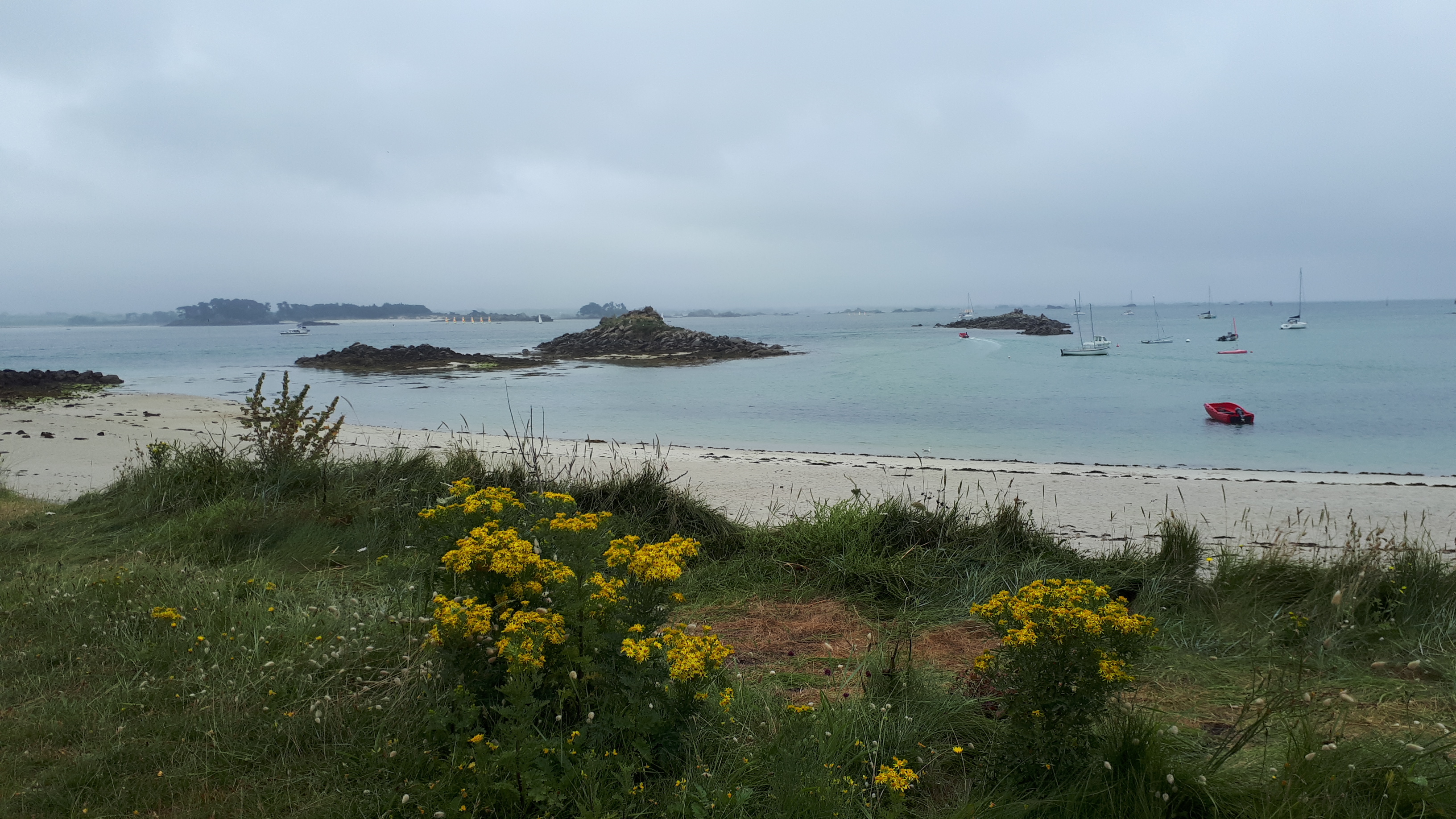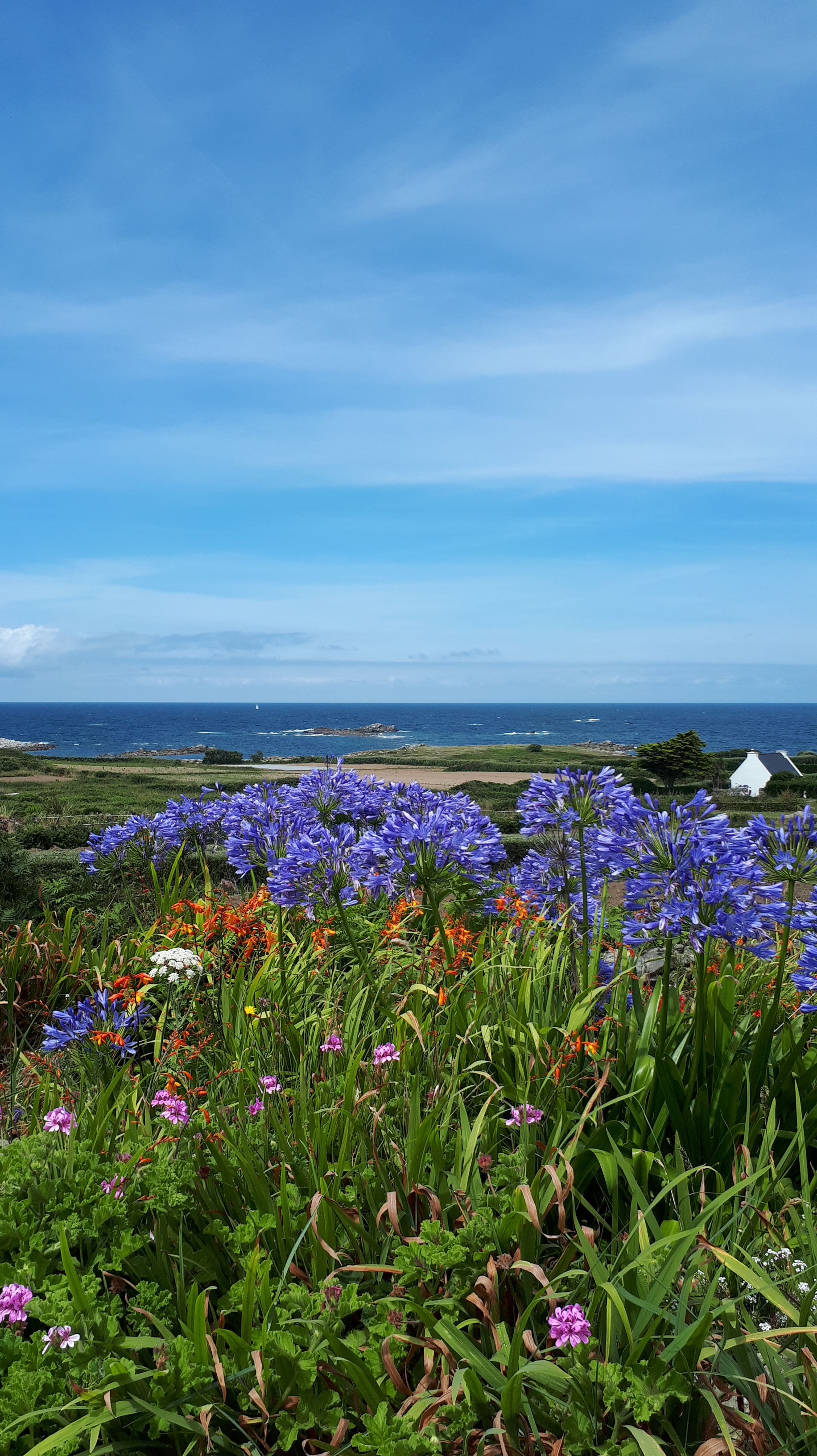Rien. Rien, il n’y a rien que quelques maisons, le large tout autour, nous deux sur un sentier, le vent dans mes cheveux, la mer à perte de vue, le bleu des agapanthes, l’odeur iodée, un phare dans le lointain, un parfum d’exotisme, une plage de sable blanc, le clapotis de l’eau sur les galets.